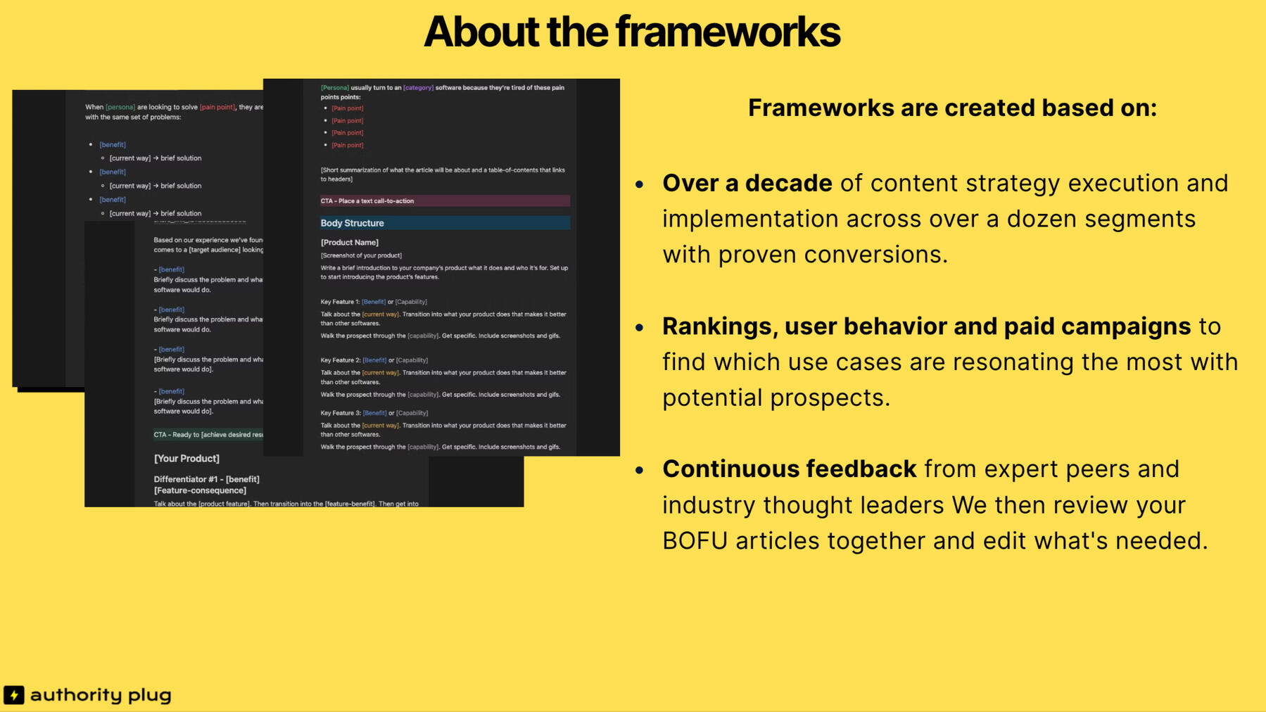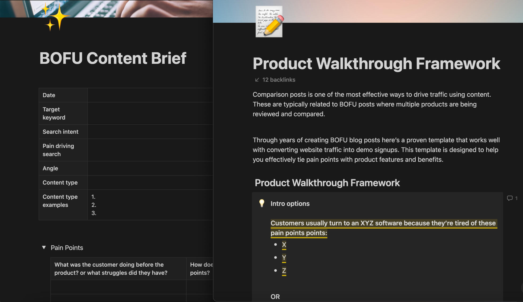 - Content brief designed specifically for BOFU articles- Helps writers methodically think through how the product solves customer pain points- High-converting content frameworks- Content briefs plug directly into the content frameworks