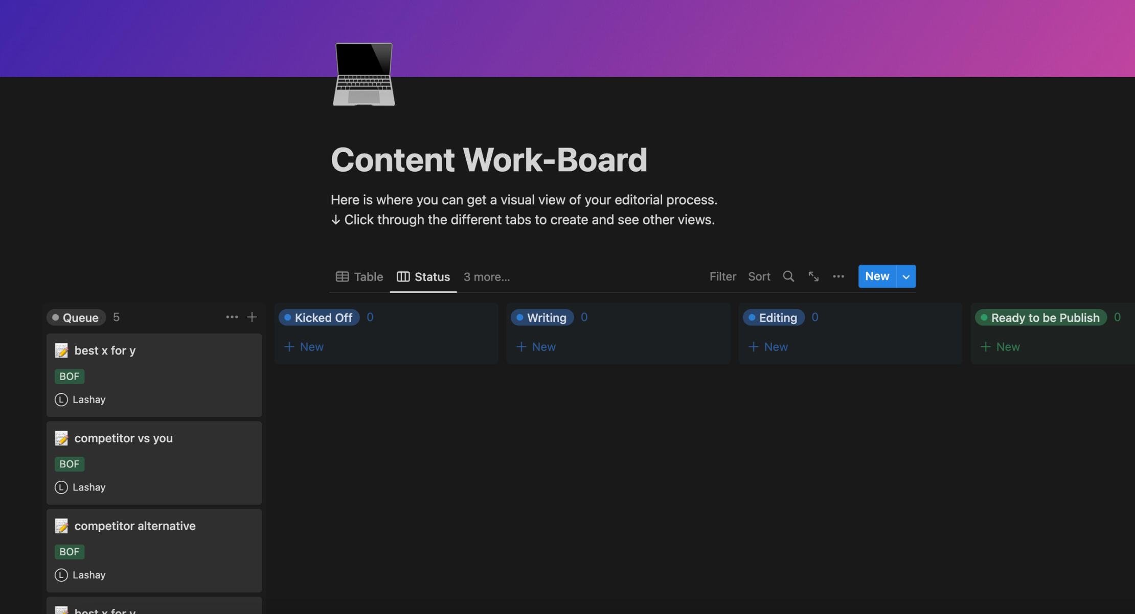 - Pulls articles directly from the keyword work-board- Simple, visual layout so you and your team knows where each piece is in the production process- Sort by whichever view works best for you