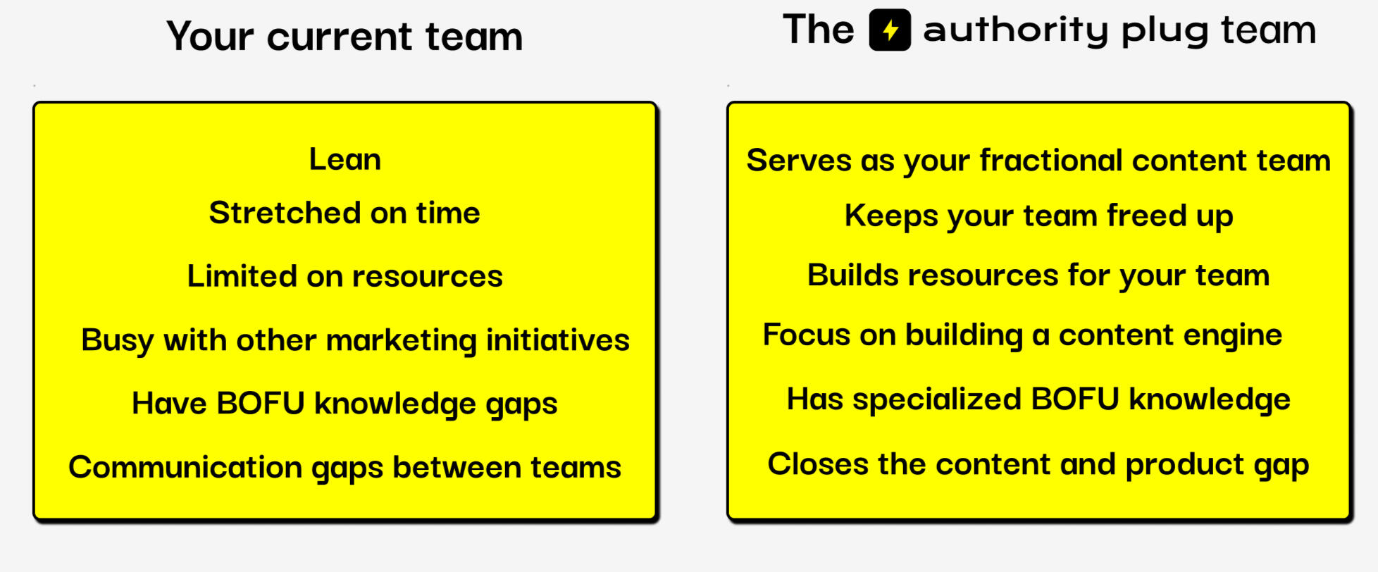 Smaller content teams usually don't have the time or resources to learn how to create or execute a BOFU content strategy. We come in and serve as your fractional content team completely running your BOFU content strategy so your content team can continue to focus on their core functions.